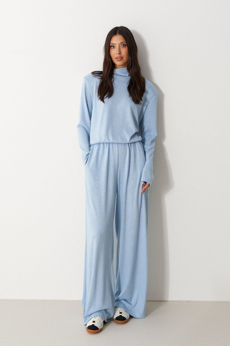 Брюки длинные, прямого силуэта. Выполнены из трикотажного полотна голубого цвета. Характеристика: брюки цельнокроенным поясом на резинке. В боковых швах потайные карманы. Низ обработан в подгибку с открытым срезом на распошивальной (плоскошовной) машине. Длина брюки по боковому шву 107 см.