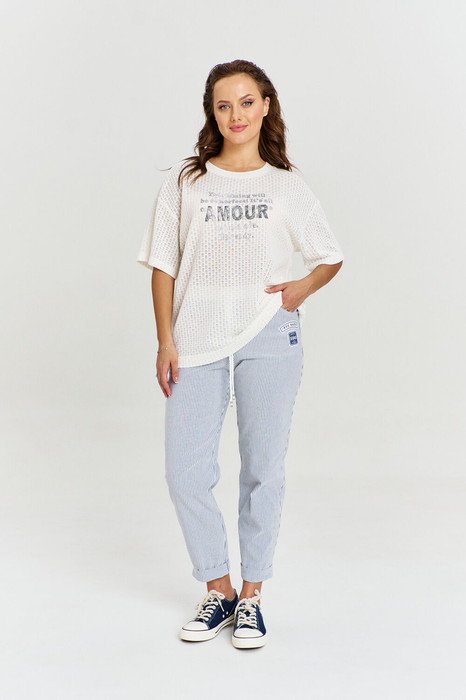 Супер комфортные брюки из стрейчевого материала в полоску, с четырьмя функциональными карманамии, трикотажным поясом на резинке. Изделие декорировано авторскими нашивками.
