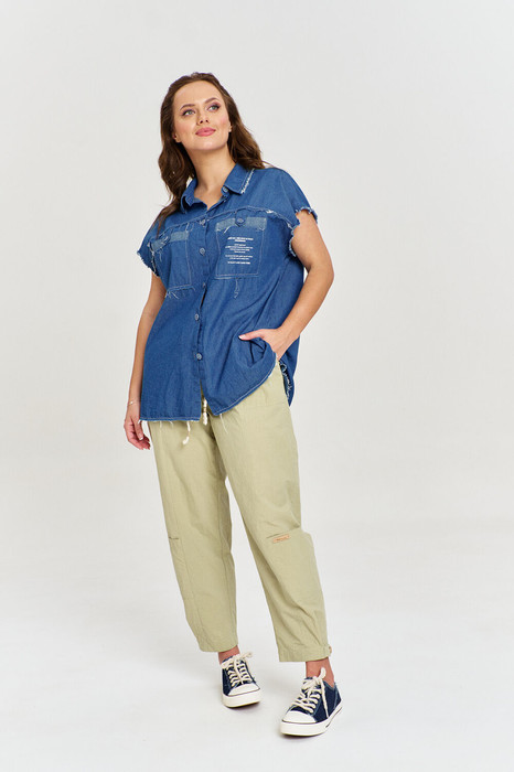 Брюки из 100% хлопковой ткани с легким крэш эффектом, свободного силуэта, зауженные к низу. В изделии шесть функциональных карманов, декорированных хлястиками с пуговицами. Пояс на резинке, с декоративным хлопковым шнуром. Ширина брюк внизу регулируется с помощью хлястика.