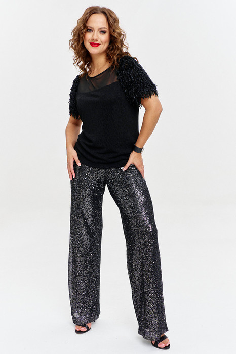 Эффектные брюки из хлопковой сетки с пайетками, прямого силуэта, с трикотажным поясом на резинке. По всей длине брюк мягкая трикотажная подкладка, что делает их невероятно комфортными.