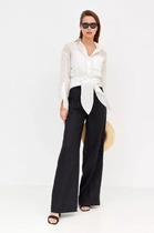 Брюки-шаровары из эко-кожи свободного силуэта, зауженные к низу, на притачном отсроченном поясе со вставленной в него резинкой. Полочка с карманом в рельефе. По переду и спинке фигурные рельефы.