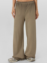 Брюки из трикотажного полотна с велюровым эффектом прямого силуэта на цельнокроеном отстроченном поясе со вставленной в него резинкой и декоративным шнурком. По бокам отрезной бочок с кантом и карманом в шве притачивания бочка.