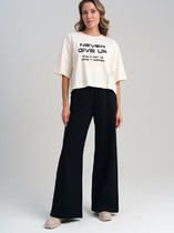 Стоит учитывать слабую растяжимость ткани и зауженность модели в бедрах.