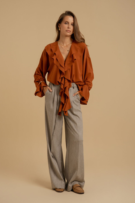 Брюки женские прямого силуэта со стрелками из костюмной ткани. Пояс - отрезной с эластичной тесьмой и застежкой на брючный крючок. В боковых швах - карманы с отрезными бочками. В размерах 44-50 есть складки в области талии. Брюки декорированы поясом в виде шнурка из основной ткани. Есть шлевки для ремня.