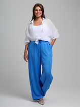 Брюки женские из трикотажного полотна «бурумчук» (шелковый креп) с набивным рисунком, прямого кроя, свободные, с карманами в боковых швах, на притачном поясе с эластичной тесьмой внутри.