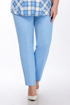 Брюки классические с заутюженными стрелками, слегка зауженные к низу, оформлены притачным поясом, частично на резинке. Застежка спереди брюк на молнию и петлю-пуговицу.