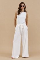 Невероятно комфортные, элегантные брюки-палаццо,  образ в котором будет привлекать к себе внимание окружающих. Идеально подходит как для офиса, так и для вечернего выхода. Брюки свободные. По переду заложены складки, в боковых швах расположены боковые карманы, застежка-молния. Пояс притачной, сзади на резинке, это обеспечивает комфортную посадку. Широкий крой палаццо добавляет образу легкость и непринужденность, стрелки визуально удлиняют силуэт.