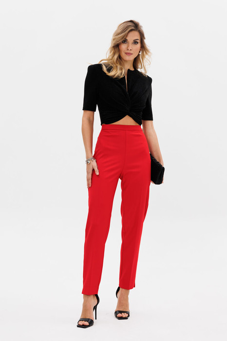Брюки выполнены из однотонной костюмной ткани, заужены к низу, на задних половинках карманы с листочкой, застежка в боковом шве на металлическую молнию и пуговицу. По низу в боковом шве разрезы.