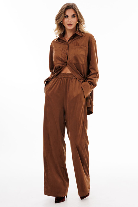Брюки выполнены из тонкой искусственной замши. Брюки прямого покроя длиной в пол, на притачном поясе с эластичной тесьмой. Спереди боковые карманы с наклонным входом.