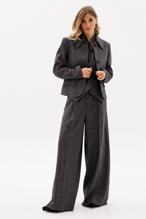 Брюки-палаццо выполнены  из костюмной ткани меланж. Брюки на притачном поясе, длиной в пол, расширенные к низу. Спереди складки и  боковые карманы с наклонным входом. Застежка спереди на молнию с гульфиком и пуговицу. На задних частях обработаны талиевые вытачки.