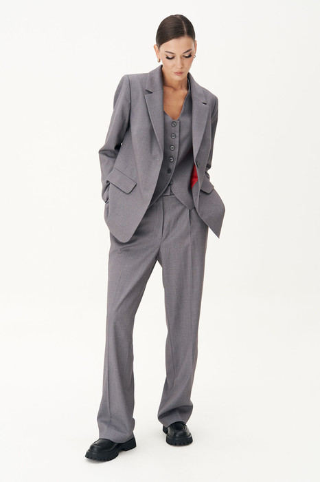 Брюки классического кроя с высокой посадкой на притачном поясе со шлёвками. Застежка брючная на потайной крючок и молнию. Передние половинки брюк с мягкой складкой-защипом и наклонными боковыми карманами. Задние половинки брюк с талиевыми вытачками и прорезными карманами с листочками.