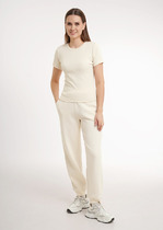 Брюки свободного силуэта слегка заужены к низу. Пояс притачной, частично на эластичной тесьме, с застежкой на петлю и пробивную пуговицу. По переду обработаны карманы с листочкой и подрезным бочком.