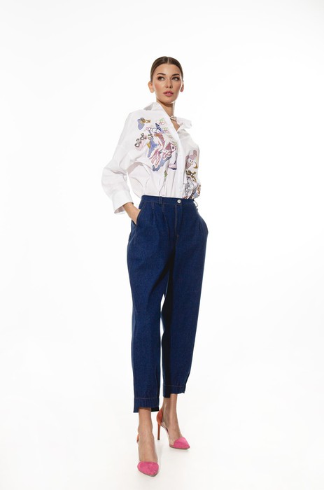 Брюки женские полуприлегающего силуэта, слегка зауженные к низу. По переду карманы с наклонным входом. Пояс притачной, по спинке пояса резинка, слева на шлевке расположен декор в виде металлического украшения. Застежка обработана на кнопку и молнию. Сзади расположены накладные карманы, на правом металлическое украшение. Брюки отстрочены отделочными строчками. По низу брюки асимметричны, перед короче. Манжета передней части на резинке.