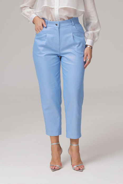 Брюки женские типа «бананы». По переду обработаны фигурные карманы, застежка на молнию, отстрочены складки. Сзади фигурная отстрочная кокетка и фигурные накладные карманы, декорированные металлическими хольнитенами. Верх обработан притачным поясом со шлевками, застегивающимся на кнопку. По низу брюк спереди и сзади отстрочены вытачки.