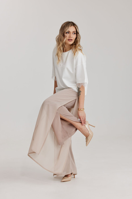 Брюки прямого силуэта, выполнены из шифоновой ткани на подкладке полной длинны. Боковой шов брюк открыт. Синка брюк заходит на перед по верхней части. Подкладка из не просвещающейся креповой ткани. Верх брюк обработан отрезным поясом. Центральная часть пояса без резинки, остальной пояс на резинке. Низ брюк обработан швом « в подгибку».