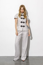 Брюки прямого силуэта, выполнены из шифоновой ткани на подкладке полной длинны. Боковой шов брюк открыт. Синка брюк заходит на перед по верхней части. Подкладка из не просвещающейся креповой ткани. Верх брюк обработан отрезным поясом. Центральная часть пояса без резинки, остальной пояс на резинке. Низ брюк обработан швом « в подгибку».
