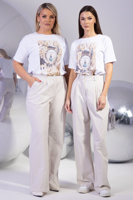 Вертикальная полоска в мелкий рисунок визуально вытягивает силуэт, добавляя образу стройности и динамики. Эта деталь делает модель универсальной: брюки легко комбинировать с однотонными блузами, объемными свитерами или приталенными жакетами.
