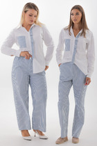 Идеальные для создания строгого и элегантного образа, прямые брюки средней посадки из ткани в полоску станут универсальным элементом вашего гардероба. Модель с заутюженными стрелками по переду и спинке подчеркивает безупречный крой, добавляя образу аккуратности и сдержанного шика.