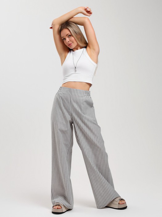 Брюки молодежные из тканого полотна с набивным рисунком в полоску, свободного покроя, с карманами в боковых швах, на притачном поясе с эластичной тесьмой внутри.