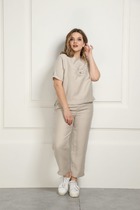 Брюки прямого кроя. Передние половинки брюк с двумя складками по переду и застёжкой по типу «гульфик». Верхний срез брюк обработан притачным поясом со шлёвками, по бокам вставлена резинка. В боковых швах карманы «хулиганы».