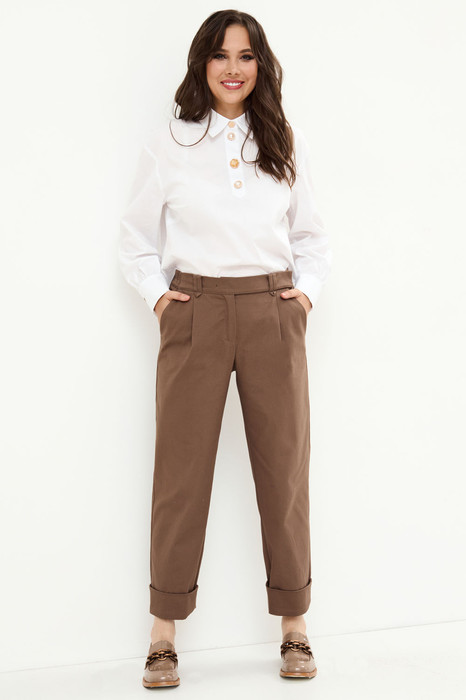 Стильные брюки свободного кроя, слегка заужены к низу, с притачным поясом. Пояс дополнен эластичной тесьмой. Выполнены из плотной хлопковой ткани. Посадка средняя. Брюки дополнены боковыми карманами. Застежка на пуговицу, потайной крючок и молнию. По низу брюки дополнены отложной манжетой. Длина брюк по боковому шву 94см.