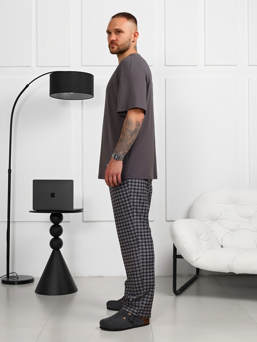Брюки в мелкую клетку из трикотажной "фланели". Модель на притачном поясе с эластичной тесьмой внутри, с карманами в боковых швах. Пояс с двумя обметанными петлями по центру, в которые вдет шнурок с наконечниками для регулирования степени прилегания изделия по талии.