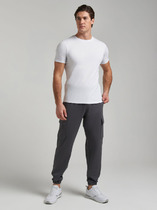 Брюки мужские из трикотажного полотна "интерлок-пике", на притачном поясе с эластичной тесьмой внутри, с карманами в боковых швах. По центру передних половинок расположены стрелки, закрепленные отделочной строчкой. Нижние срезы обработаны подгибкой с эластичной тесьмой. Для регулирования степени прилегания изделия по линии талии предусмотрен декоративный шнурок, вставленный в пояс и продетый через две обметанные петли в центре.