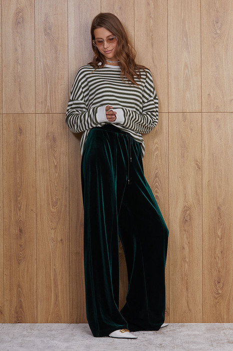 Струящиеся брюки из бархата прямого силуэта. Брюки без застежки. Карманы в боковых швах. Изделие на поясе, в который вставлена резинка.