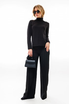 Брюки женские из трикотажного полотна «футер-двунитка», длинные, полуприлегающего силуэта, на притачном поясе с эластичной тесьмой внутри и карманами в боковых швах. Передние половины застрочены по центральным линиям, на задних половинах обработаны две вытачки в области талии.