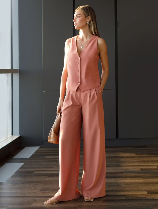 Состав: 70%Лиоцелл (Вис) 30%ПЭ Параметры модели на первом фото: Рост 170, бюст 89, талия 63, бедра 92Брюки выполнены из плотного лиоцелла. Модель дополнена карманами и высоким поясом на пуговицах. Ткань изделия отлично держит форму, плавно драпируется и не просвечивает. В теплое время года приятно охлаждает кожу. Добавление синтетических волокон в составе изделия, предотвращает сминаемостьи поддерживает формоустойчивость. Брюки сочетаются в костюме с топом D23.063 и блузкой D29.266, D29.267 и жилетом D27.002
