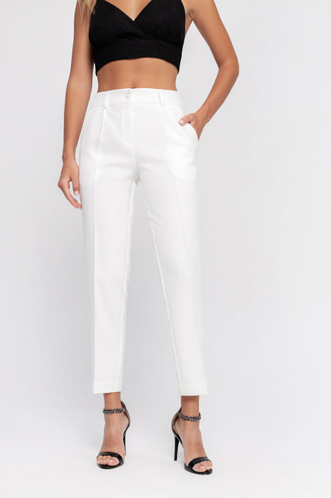 Классические укороченные брюки из текстильной ткани. Детали: брюки со средней посадкой, притачной пояс со шлевками, передние половины с небольшими мягкими складками и заутюженными стрелками, застежка на молнию и пуговицу, боковые карманы.