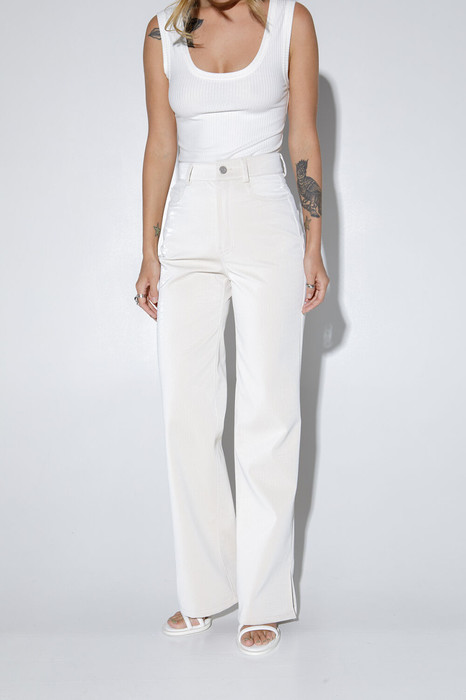 Прямые брюки из фактурной экокожи с анималистичным рисунком. Детали: брюки с высокой посадкой, прилегающий силуэт, притачной пояс со шлевками, застежка на молнию и пуговицу, перед с боковыми карманами, спинка с кокеткой и двумя накладными карманами, разрезы по низу боковых швов. Изнанка брюк на хлопковой основе.