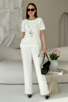 Детали: высокая посадка, притачной пояс со шлевками, передние половины с небольшими застроченными мягкими складками и заутюженными стрелками, застежка на молнию и пуговицу, боковые карманы. Задние части брюк с вытачками и заутюженными стрелками. Пояс брюк прямой, без резинки.