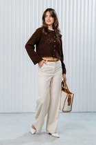 Детали: брюки с высокой посадкой, прилегающий силуэт, притачной пояс со шлевками, застежка на молнию и пуговицу, перед с боковыми карманами, спинка с кокеткой и двумя накладными карманами.