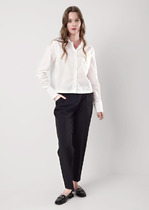 Детали: притачной пояс со шлевками, передние половины с заутюженными стрелками, застежка на молнию и потайные крючки, боковые карманы. Задние части брюк с вытачками и заутюженными стрелками. Пояс брюк без резинки.
