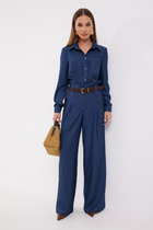 Брюки - молодежные из трикотажного полотна «кулирка» с набивным рисунком «полоска», длинные, свободные, на притачном поясе с эластичной тесьмой внутри, выполненным из двух видов ткани: с набивным рисунком и гладкокрашеной. В пояс вставлен декоративный шнурок, продетый через две обметанные петли в центре пояса.