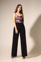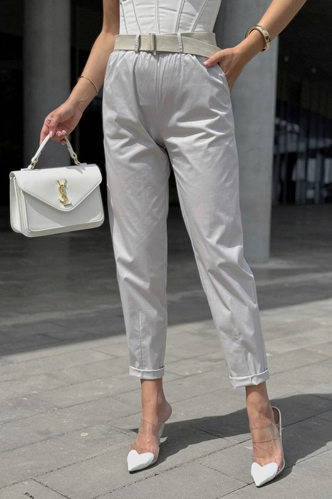 Брюки женские из текстильной ткани, слегка заужены к низу. В боковых швах расположены карманы. По низу передних половинок есть защип. Задняя половинка брюк с отрезной кокеткой и накладными карманами. Вверх брюк обработан поясом с резинкой (без молнии).  ПОЯС  ВХОДИТ В КОМПЛЕКТ.