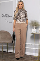 Брюки женские из текстильной ткани, слегка заужены к низу. В боковых швах расположены карманы. По низу передних половинок есть защип. Задняя половинка брюк с отрезной кокеткой и накладными карманами. Вверх брюк обработан поясом с резинкой (без молнии).  ПОЯС  ВХОДИТ В КОМПЛЕКТ.