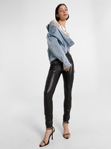 Модель прямого силуэта. Пояс комбинированный, со шлёвками, сзади собран на резину. Спереди карманы в подрезных бочках. Застёжка на молнию и крючки на поясе. Сзади прорезной карман с листочкой и застёжкой на пуговицу. Ремень в комплект не входит.
