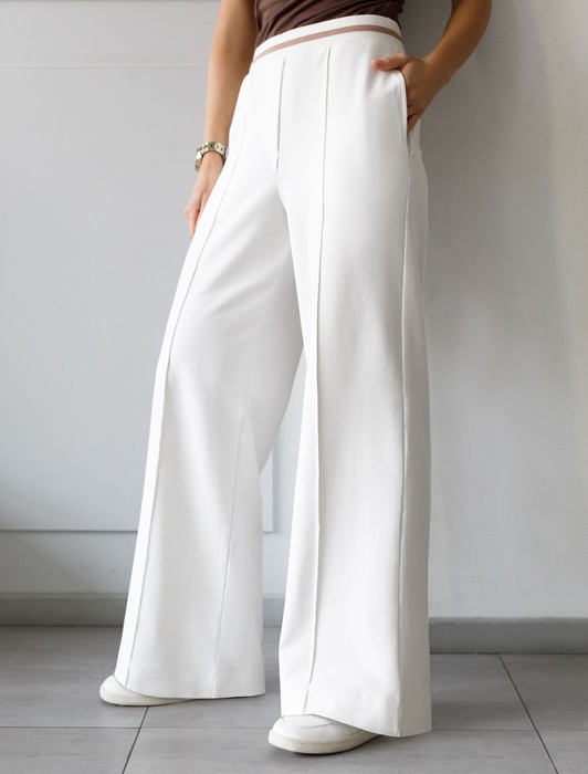 Состав: 95%Хлопок 5%ПУ Плотность: 240 Г/м2Брюки белого цвета с удобным эластичным поясом на резинке и карманами по бокам выполнены из премиального футера-двухнитки плотностью 240 Г/м2. Наличие эластана в составе гарантирует комфорт и долговечность изделия, материал хорошо пропускает воздух, позволяя телу дышать. Свободный прямой крой обеспечивает свободу движений и максимальное удобство в любых ситуациях, поэтому они подойдут и на большие размеры, а так же на высокий или низкий рост. Фигура подчеркивается, а силуэт визуально вытягивается за счет кроя палаццо и застроченных декоративных стрелок. В повседневных трикотажных брюках вы будете чувствовать себя комфортно и уверенно, наслаждаясь каждым моментом дня. Спортивные брюки подходят для демисезонного использования, в летний период, для занятий спортом в помещении и на улице, а также как часть стиля casual.