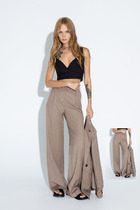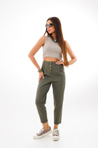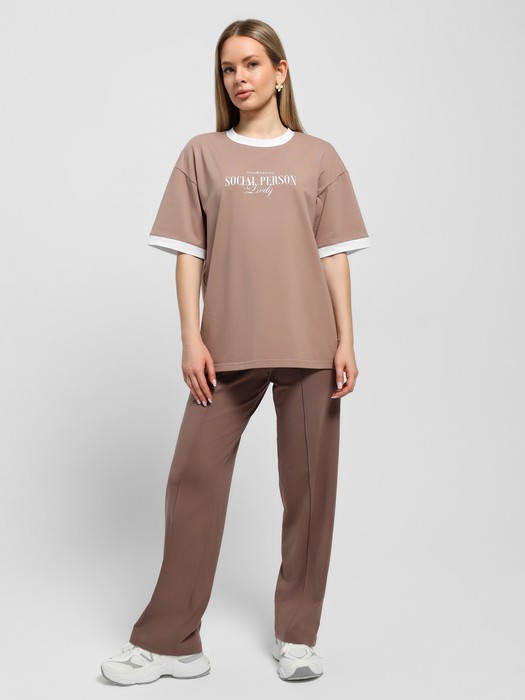 Брюки – из гладкокрашеного трикотажного полотна "кулирка с лайкрой"длинные, классического кроя, на притачном поясе с эластичной тесьмой внутри и карманами в боковых швах. Передние половины брюк застрочены по центральным линиям. По центру пояса настрочен декоративный элемент