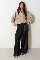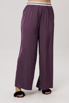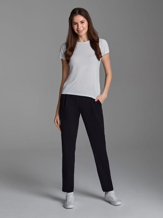 Брюки женские из хлопкового трикотаж в стиле "каррот" с небольшими складками по линии талии. Карманы брюк прорезные, с боковыми вставками. Вдоль боковых швов брюк нашита декоративная трикотажная лента с серебристой нитью. Низ брюк заужен. Пояс брюк настрочен на эластичную резинку, дополнительно регулируется шнуром.