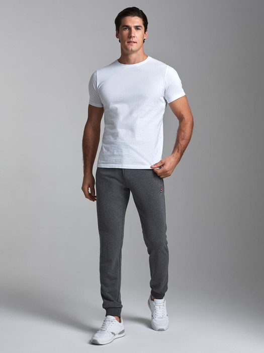 Брюки мужские из хлопкового трикотажного полотна на манжетах из рибаны. На передних половинках карманы с листочкой на молнии. Пояс по талии регулируется шнурком. Под карманом на правой половинке настрочен шеврон с фирменным логотипом.