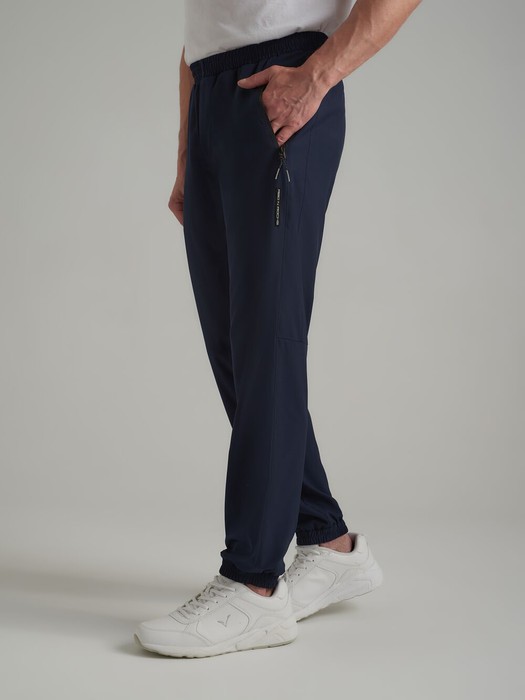 Мужские брюки из облегченной плащевой ткани без подкладки. На передних половинках выполнены прорезные карманы с открытой молнией. Пояс по талии регулируется шнуром. По боковым швам отстрочка. На левой половинке под карманом настрочен шеврон с фирменным логотипом.