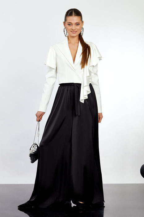 - пояс спереди с прямой вставкой и двумя завязками; сбоку и сзади — на эластичной резинке
