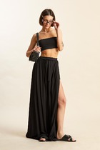 - пояс спереди с прямой вставкой и двумя завязками; сбоку и сзади — на эластичной резинке;
