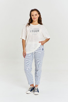 Брюки женские из трикотажной ткани (двунитка), слегка заужены к низу. По переду брюк расположены накладные карманы. На левом кармане настрочной декоративный элемент. В пояс вставлена резинка по кругу.