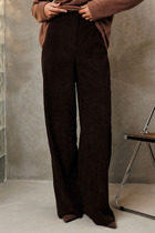 Брюки прямые, из текстильной ткани, с отлетной деталью по переду, закрепленной на отделочную кнопку. застежка брюк спереди на тесьму "молния" и петлю с пуговицей. Пояс отрезной, по переду гладкий, сзади на резинке.