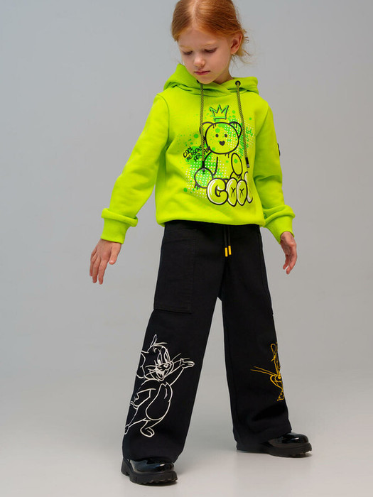 Джинсы детские для девочки. Джинсы из сверхудобного эластичного материала Loop Denim. Loop denim имеет внешний вид классической джинсы, а по тактильным ощущениям мягкий и комфортный, как трикотаж. WIDE LEG - свободная посадка и расклёшенные от бедра штанины. Высокая посадка. Джинсы на резинке со шнурком. Накладные карманы. Контрастный лицензионный принт.