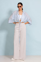 Брюки прямые свободного кроя с накладными карманами. . Притачной пояс с кулиской. Посадка средняя. Длина изделия по боковому шву 110 см, по шаговому шву 82 см.